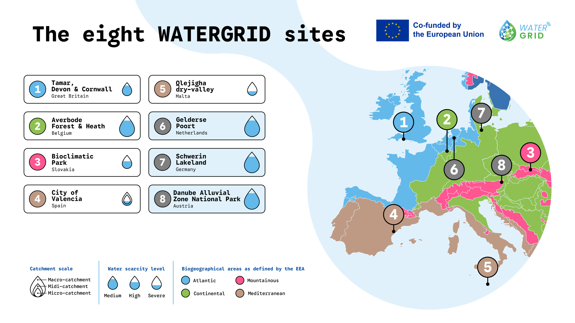 WATERGRID operates through 8 Demonstration and Validation Sites across four distinct European biogeographical regions: Atlantic, Continental, Mountain, and Mediterranean.